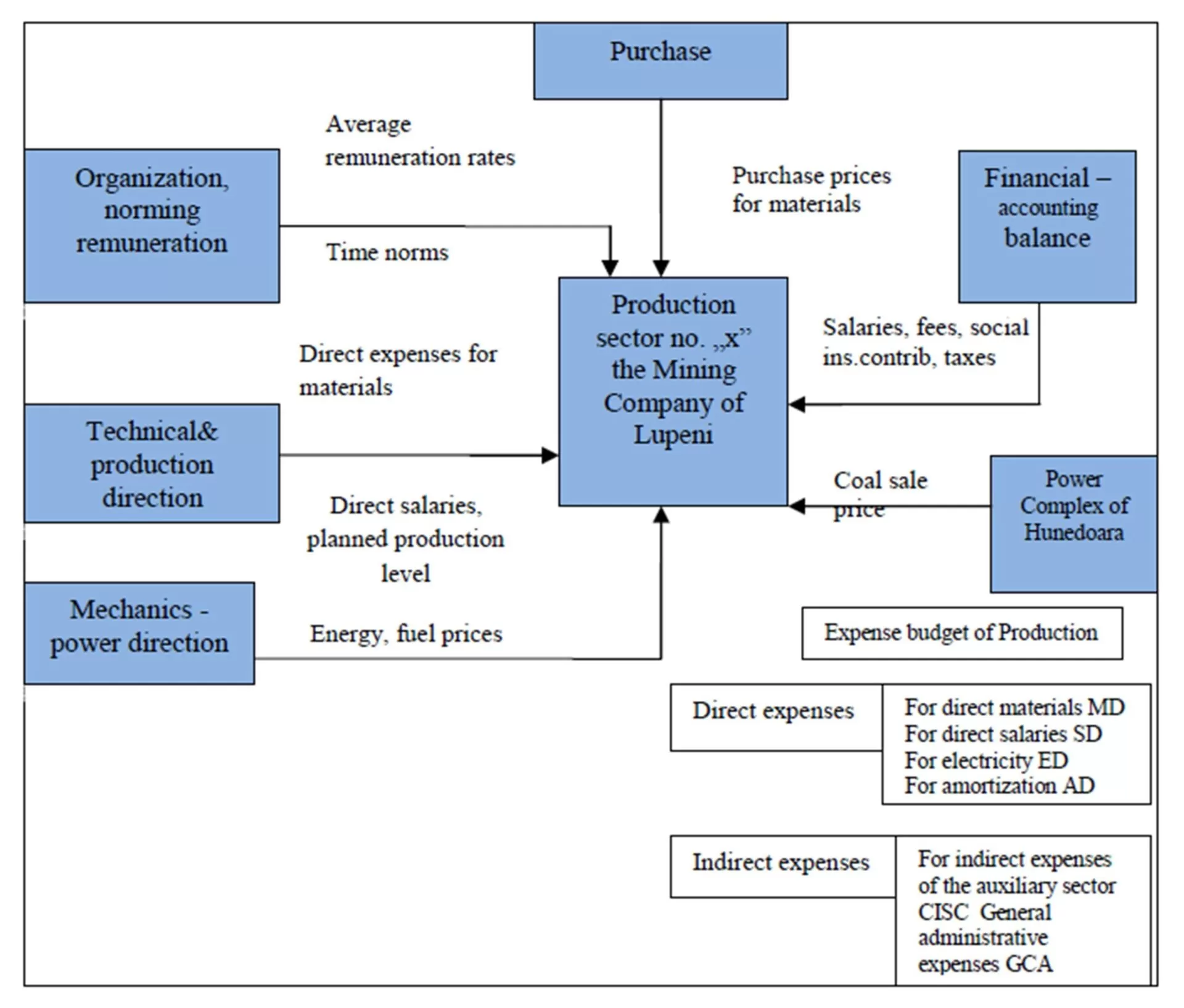 From the perspective of the production features, in the companies of the coal mining industry, cost centres can be developed analytically up to the production and auxiliary sectors level – where a number of successive operations takes place. Thus, the pattern for the cost-based budget (BC) of a coal mine can be mathematically represented by means of a formula made up of several terms, namely: the sum of budgets related to the direct expenses on the company level, plus the sum of budgets related to the indirect production expenses on the company level, plus the budget of the general administrative expenses on the company level, and the share of sales expenses, pertaining to it from the budget of sales, namely: