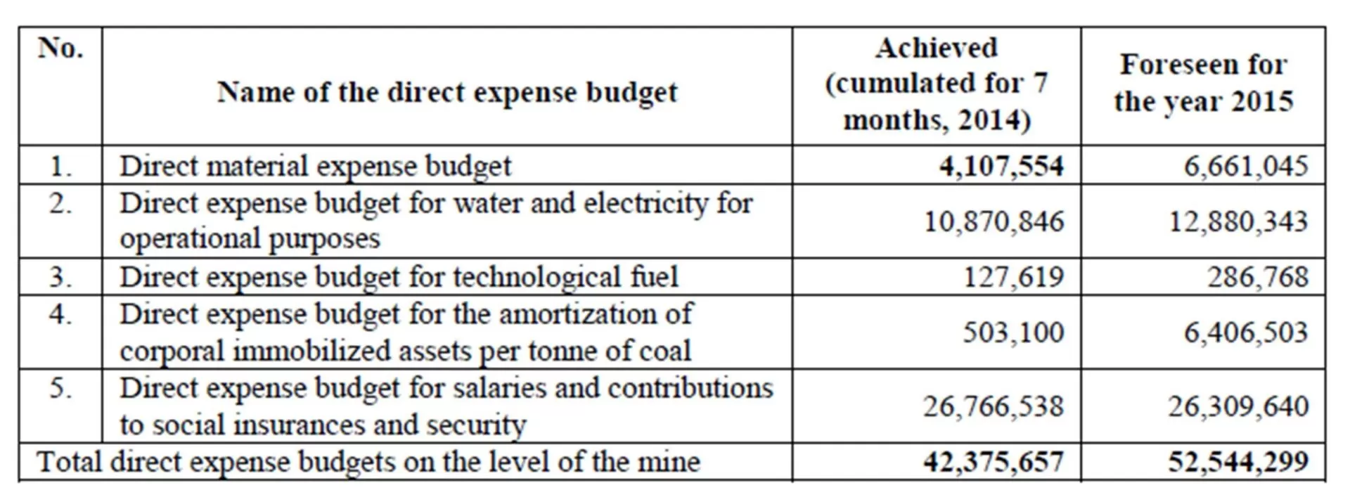 Table 1: Direct expense budget of the Coal Mine of Lupeni – RON –