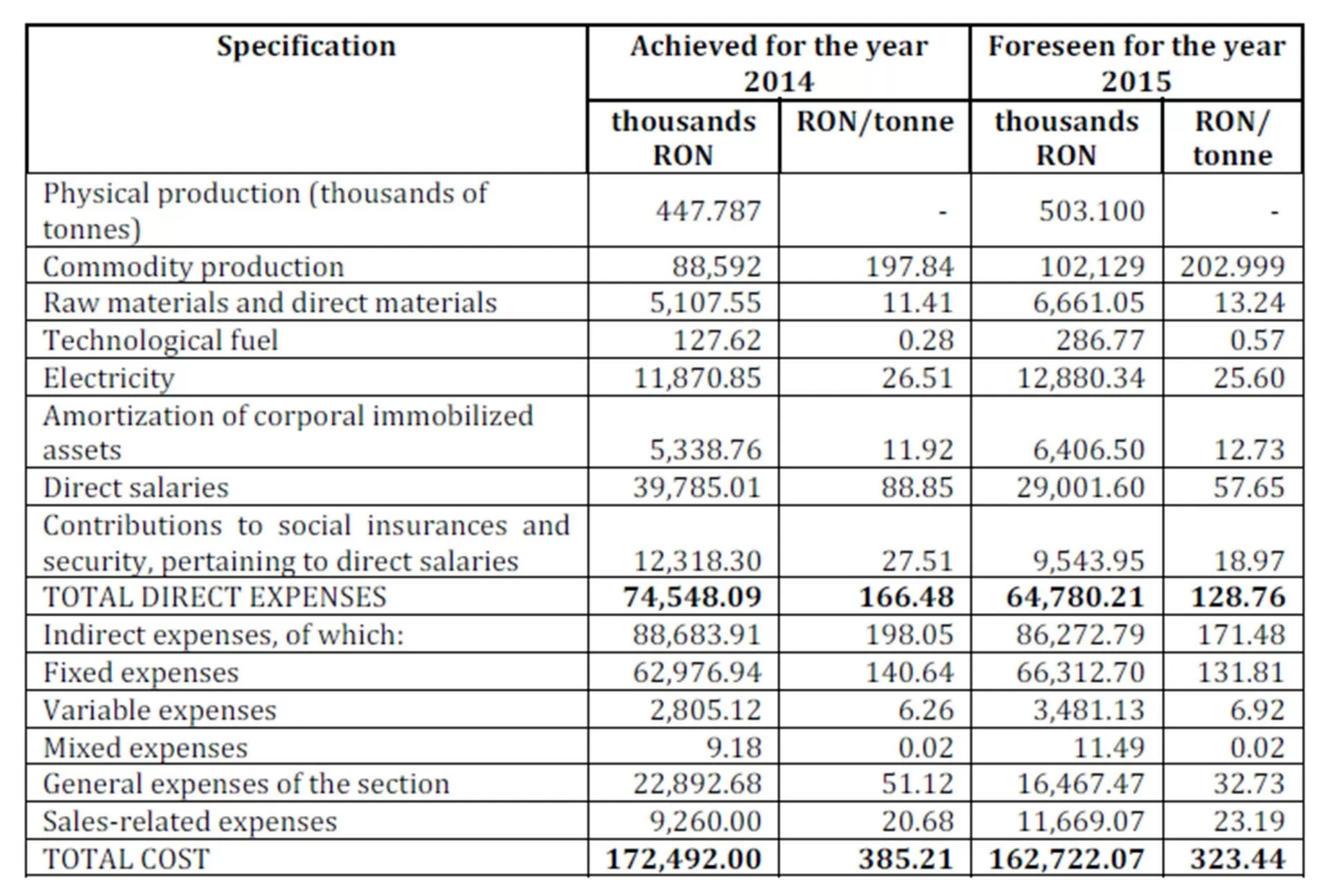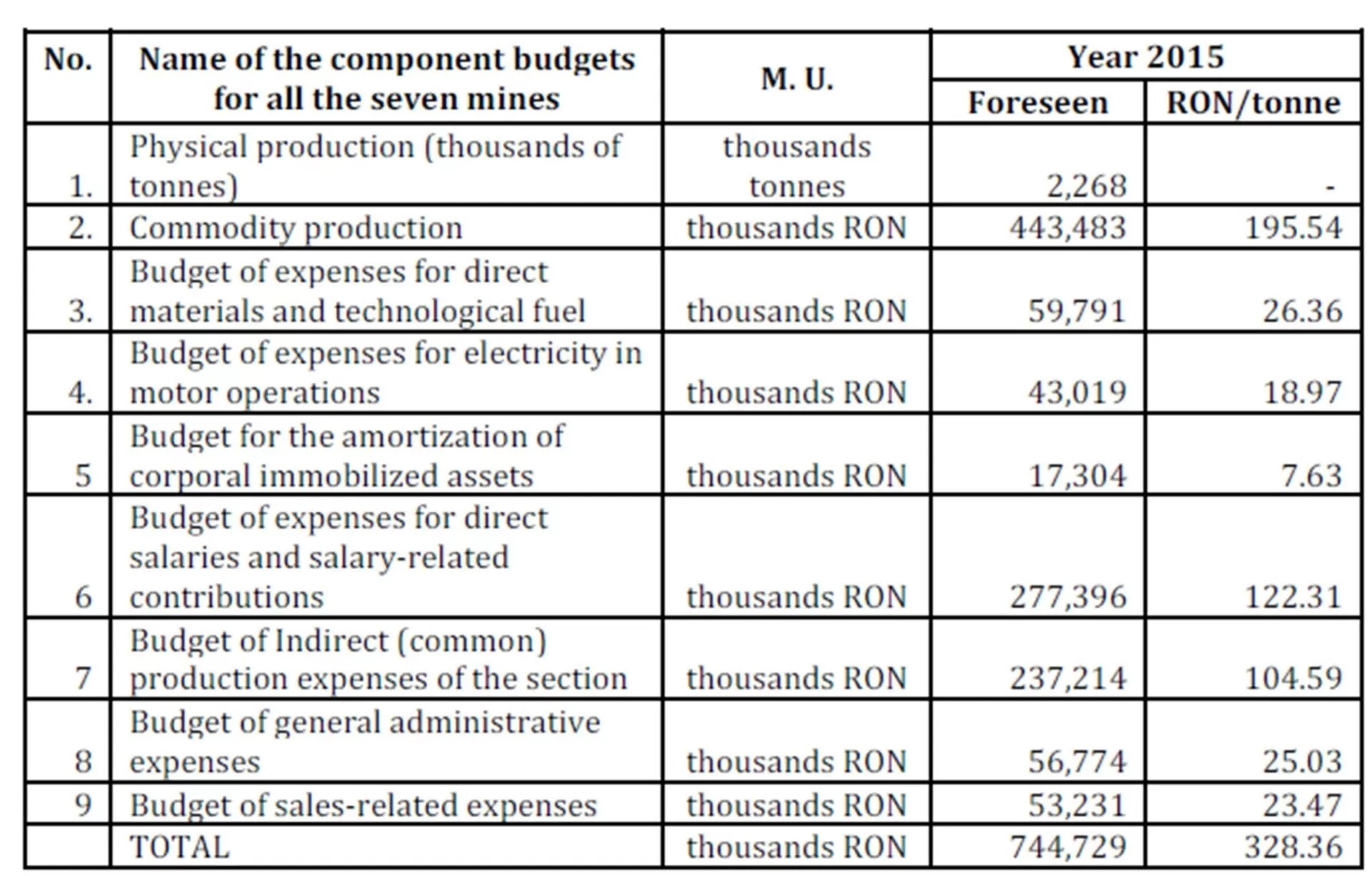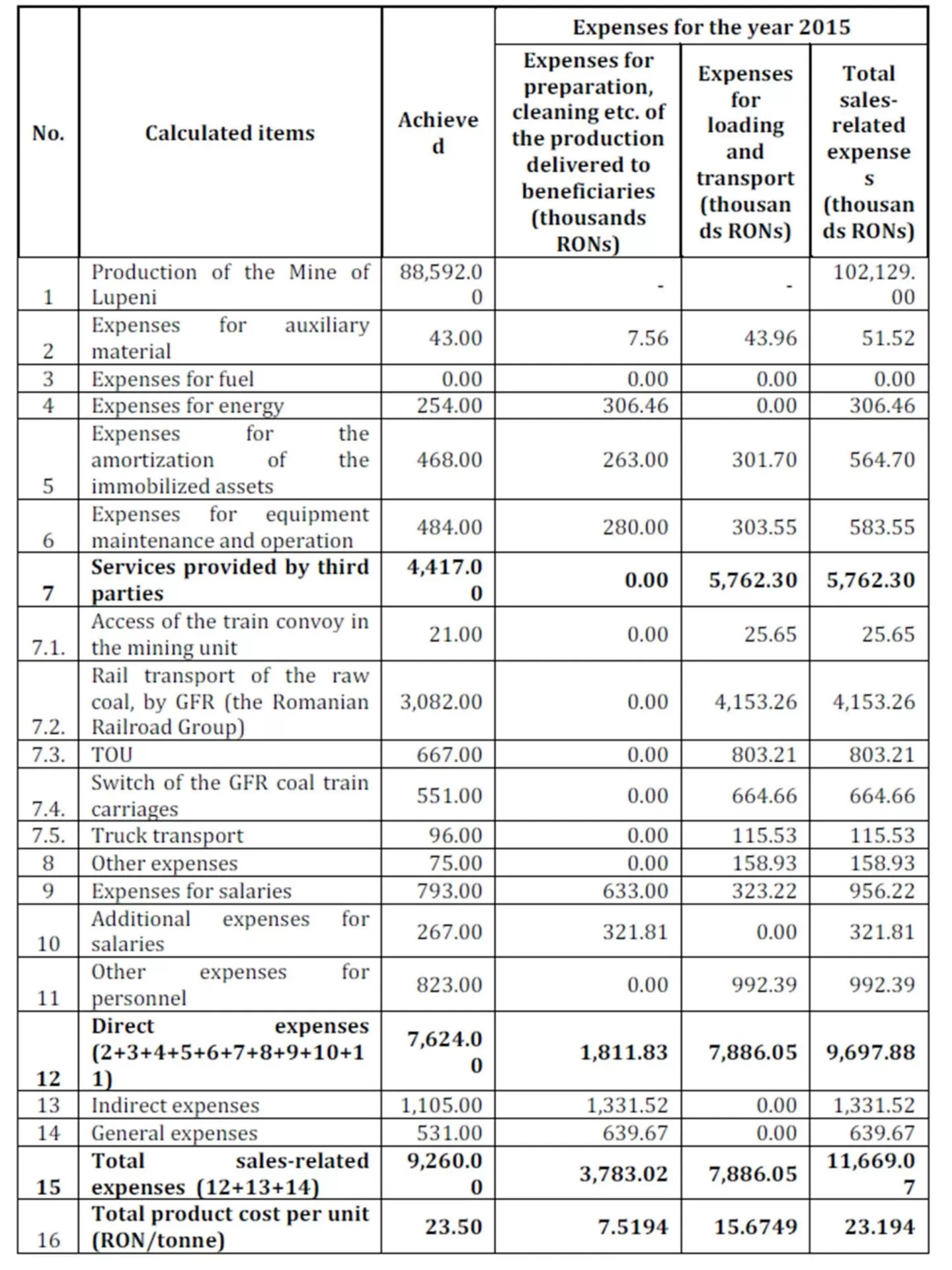 As one can see in this table, on the level of the budgetary year 2015, the standard production volume of the coal mine is foreseen to be 503,100 tonnes, the commodity production is foreseen to be102,129 thousands RON, and the price per unit according to our calculations is of 202.99 RON/tonne. Thus, we can calculate the cost per unit for a tonne of mined coal, using the following relation:
