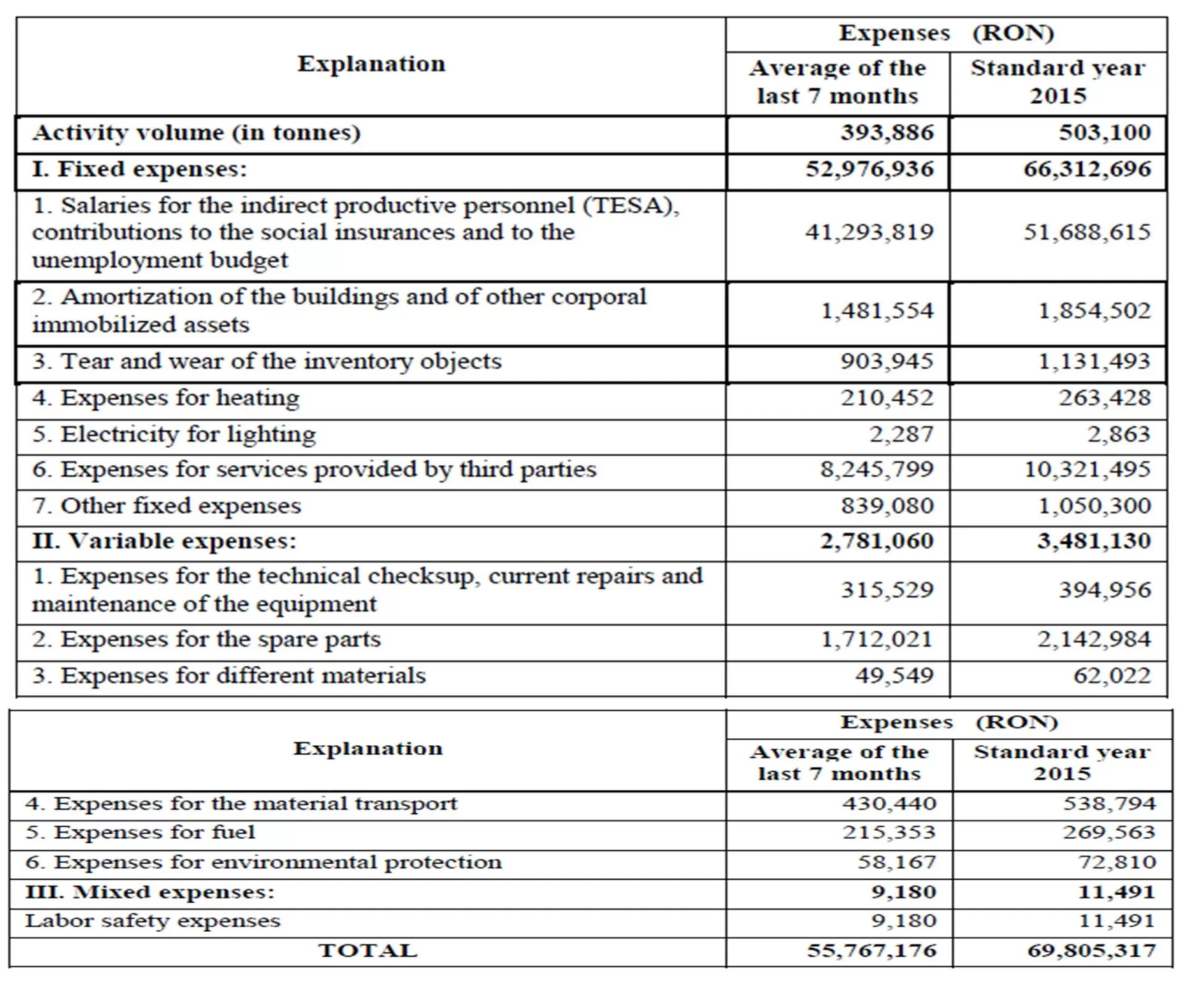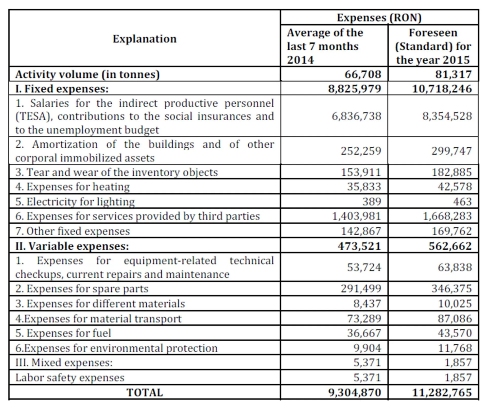 As one can notice in the above-mentioned budget, the fixed expenses foreseen for the year 2015 amount to 66,312,696 RON, the variable expenses amount to 3,481,130 RON, and the mixed expenses have a value of 11,491 RON.
