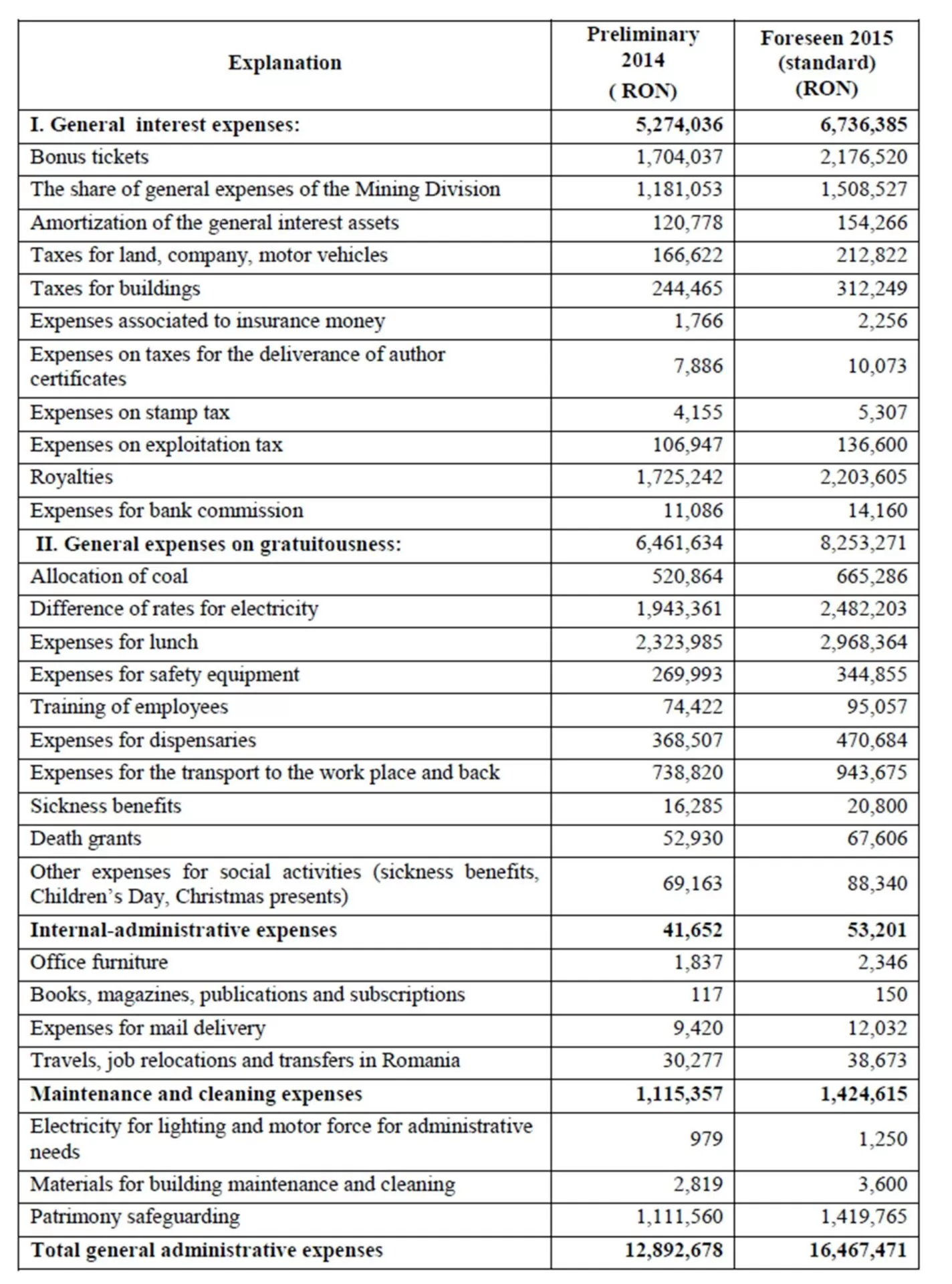 The companies in the coal mining industry include four expense classes, grouped as follows: “general interest expenses, which include the share of 60%, of the Power Complex of Hunedoara — Mining Division Branch (represent the expenses for personnel, considered to be 60% of the expenses of the Power Complex of Hunedoara, distributed to the Coal Mine of Lupeni), amortization of corporal immobilized assets of general interest; buildings, land, motor vehicle taxes etc.); general expenses regarding the gratuitousness (allocation of coal; differences of rates for electricity; heating taxes etc.); internal administrative expenses (office furniture; contracts with third parties, magazines, publications; travels, job relocations, job transfers etc.); maintenance and cleaning expenses (materials for building maintenance and cleaning; water, sewage, sanitation etc.)”.