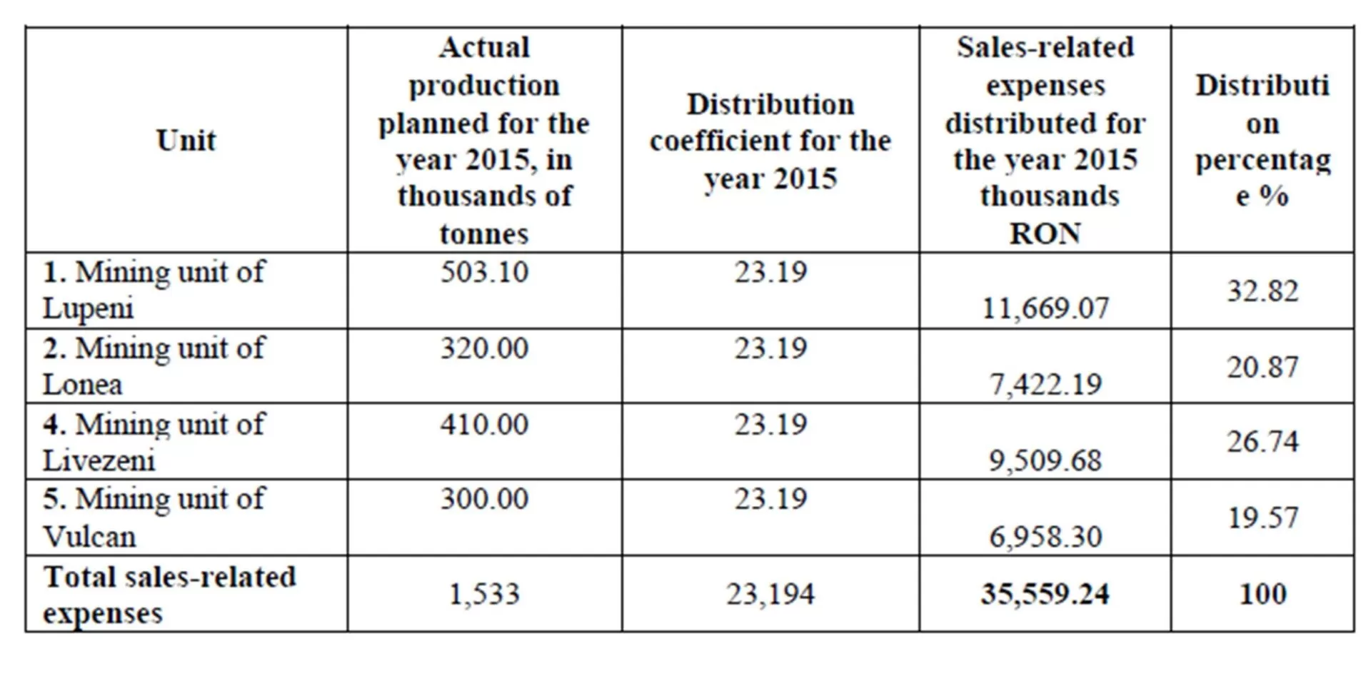 Thus, following the application of this distribution criterion per each of the seven mining units, in Table no. 5, we show the sale-related expenses distributed to them, for the year 2015.