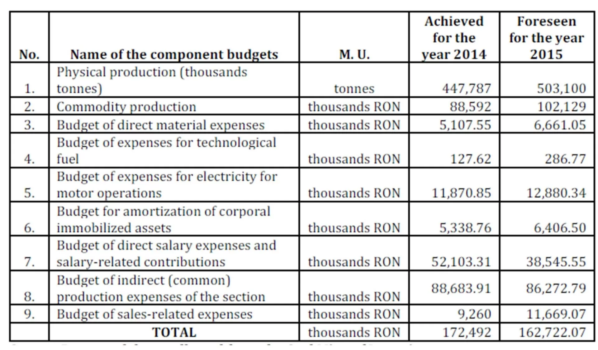 Consequently, in Table no. 10 we present the model of budget of the cost per production unit drafted for the coal mine under analysis, i.e. the Mine of Lupeni, for the year 2015.