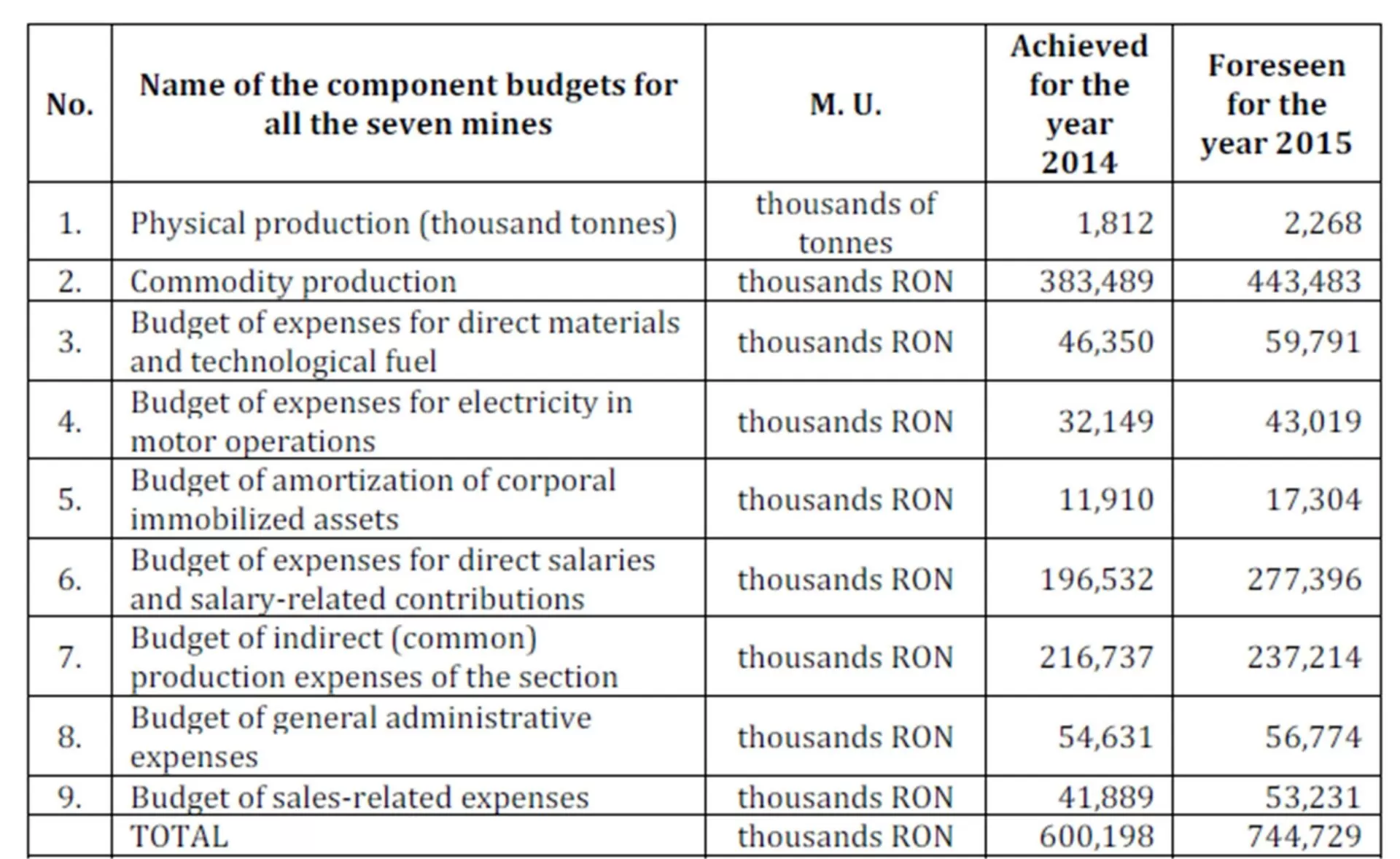 Table 9: Budget of the Power Complex of Hunedoara — Mining Division Branch – E.M.Lupeni