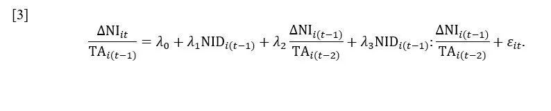 where ΔNI is the change in the net income, TA is the total assets, and NID is an indicator taking the value one if ΔNI is less than 0 and 0 otherwise. A larger negative coefficient on the negative income (λ3) in the post-adoption period is consistent with more timely loss recognition after IFRS adoption that is, losses are less persistent.