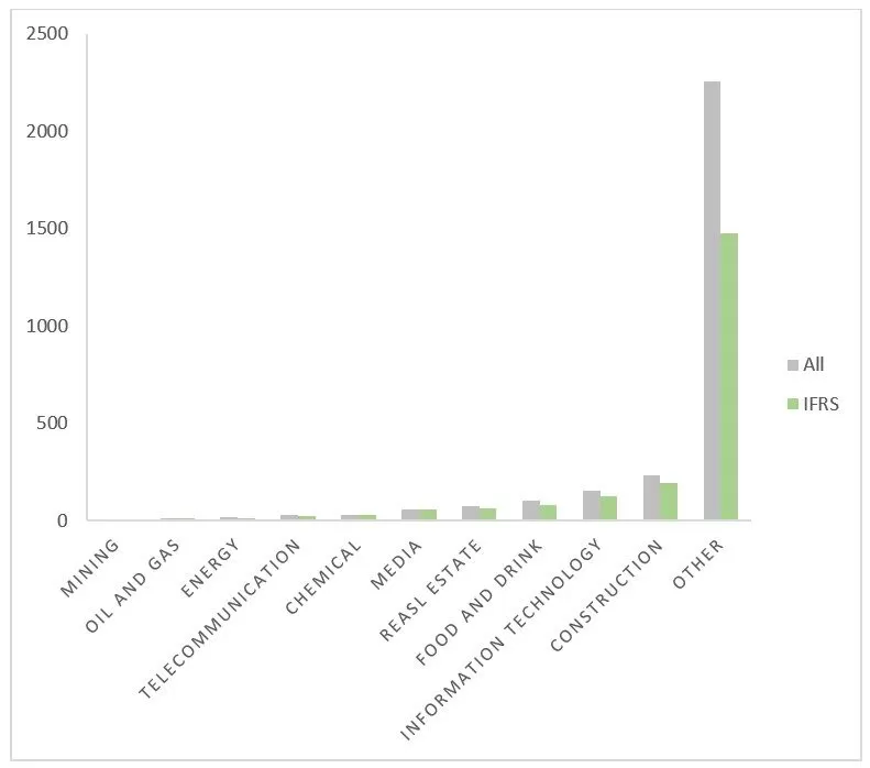 The sample consists of 2977 firm-year observations of Polish-based companies quoted on the Warsaw Stock Exchange – WSE (Poland) between 2004 and 2019. During the study, year-end standalone financial statements, auditors’ opinions and share quotations obtained from the Notoria database were used. Additionally, data of the aforementioned companies obtained from the National Court Register were analyzed. For each of these firms, the accounting standards applied to the annual reports were checked and a sample of ‘switch companies’ was designed – i.e. companies that transformed their accounting framework from Polish Accounting Rules (PAR) to International Financial Reporting Standards (IFRS). These were all transformations into IFRS during the years 2004-2019 on the WSE that referred to standalone financial statements only. The sample excludes group financial statements. Table 1 and chart 1 present an industry breakdown of the sample.