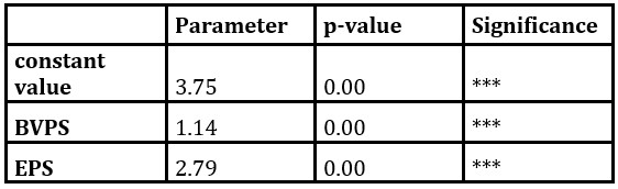Based on table 7, the variable BVPS is significant at 1‰, and the constant value at 1% significance level.