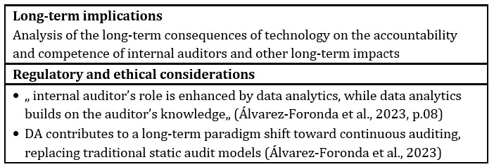 In the context of the analysis of long-term implications (Table 3), not many findings were found, except for individual ones according to which “internal auditor’s role is enhanced by data analytics, while data analytics builds on the auditor’s knowledge” (Álvarez-Foronda et al., 2023, p.08) with an indication of a change in the internal audit paradigm static model towards continuous auditing (Álvarez-Foronda et al., 2023).