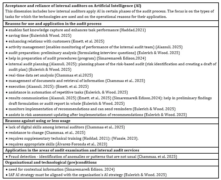 Regarding the reasons for accepting AI and its application in the audit process (Table 4), similar conclusions were found as for the reasons for accepting DA. They relate to cost savings, improved execution (Haddad, 2021), time savings (Eulerich & Wood, 2025), and improved relations with audit clients (Emmett et al., 2025). The possibility of using AI to supervise the performance of the audit team was also identified (Alassuli, 2025). Regarding the internal audit process, AI can be used in the preparation of audit assignments and preliminary analyses, especially in preparing questions for employee interviews (Eulerich & Wood, 2025), in developing the audit program (Simaremare & Edison, 2024), and in risk analysis during the planning phase and the creation of an audit plan (Alassuli, 2025; Eulerich & Wood, 2025). This is further supported by the capability for real-time data analysis (Chammaa et al., 2025). In conducting fieldwork, AI is used in the management of documents as well as in information recovery (Chammaa et al., 2025), it also automates repetitive tasks (Eulerich & Wood, 2025) during execution. Communicating the results is a phase in which AI has significant application possibilities (Simaremare & Edison, 2024; Alassuli, 2025; Emett et al., 2025), with the possibility of using it when preparing a draft report or a complete report (Eulerich & Wood, 2025). In addition to the mentioned phases, it is also possible to use it in the phase of monitoring the implementation of recommendations (Eulerich & Wood, 2025) and in risk assessment after the implementation of recommended activities, i.e. corrections or corrective actions (Eulerich & Wood, 2025).