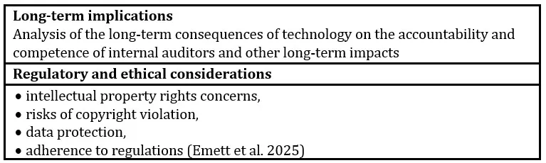 As in the case of the analysis of the long-term implications of the use of DA in internal audit, there are no discussions or conclusions on this topic in the field of artificial intelligence applications either. The terms mentioned in this context include issues related to intellectual property rights, the potential for copyright breaches, data privacy requirements, and the need to comply with regulatory standards (Emmett et al., 2025).