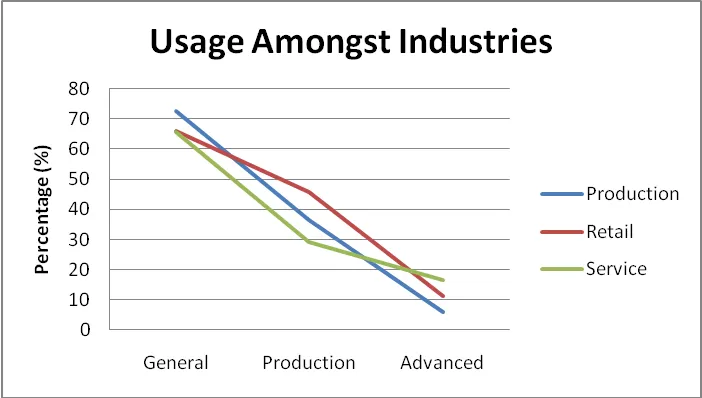 There was a slight indication that the usage between the three industries in the sample differs, as shown in figure 2. It appears that the Production industry uses the most general ICT technologies and the least advanced ICT technologies. The Services industry seemed to have invested the most out of the three in Advanced ICT technologies and the Retail industry the most in Production-Orientated ICT technologies. However, these results are not fully conclusive since there were more production and retail SMEs in the sample than service SMEs.