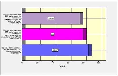 Figure 8 shows that 85.67% of respondents felt that ICTs had enhanced their livelihoods. 80% felt that ICTs empowered them in decision making that affect their lives and 75.56% indicated that ICTs gave them a voice. 69.2% of the interviwees identified radios as the tools that have empowered them the most while 51.6% cited newspapers as useful source of information. The task then is to find an ICT enabled method that suppliments newspapers as a source of information. However, there is a 13.19 % group of respondents that use ICT for passing important information faster.