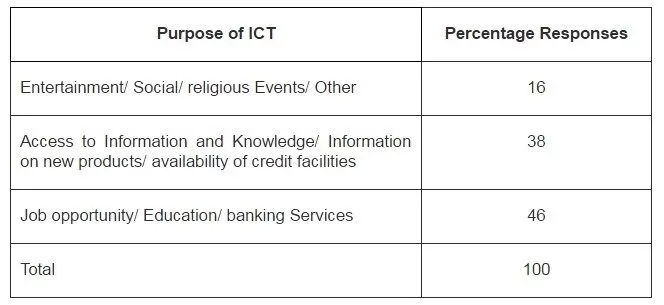 The questionnaires addressed aspects of the study such as: economic status of interviewees, access, use and ownership of ICTs, available ICT services and infrastructure; impact of ICTs on social and economic development; and the purpose and benefits of ICTs. In some cases, the researchers or research assistants filled up the questionnaires on behalf of the target population based on the answers they gave because of the low literacy rates in the two villages. Some of the community members found it difficult to read and write. Of the hundred questionnaires distributed, ninety—one (91) were completed successfully and returned giving a response rate of 91%. The data analysis was done using SPSS V2 (SPSS 2).