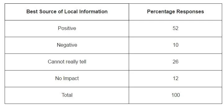 As shown in Table 4 above the best sources of local information are radio , T.V and newspaper combined as indicated by 60% of the respondents. This is followed by a 27.47% that use Post Office mail, community forums and word of mouth as second source of local information. Modern ICT tools such as e-mail, internet and faxes (12,09%) are used by a very small propotion of the community.