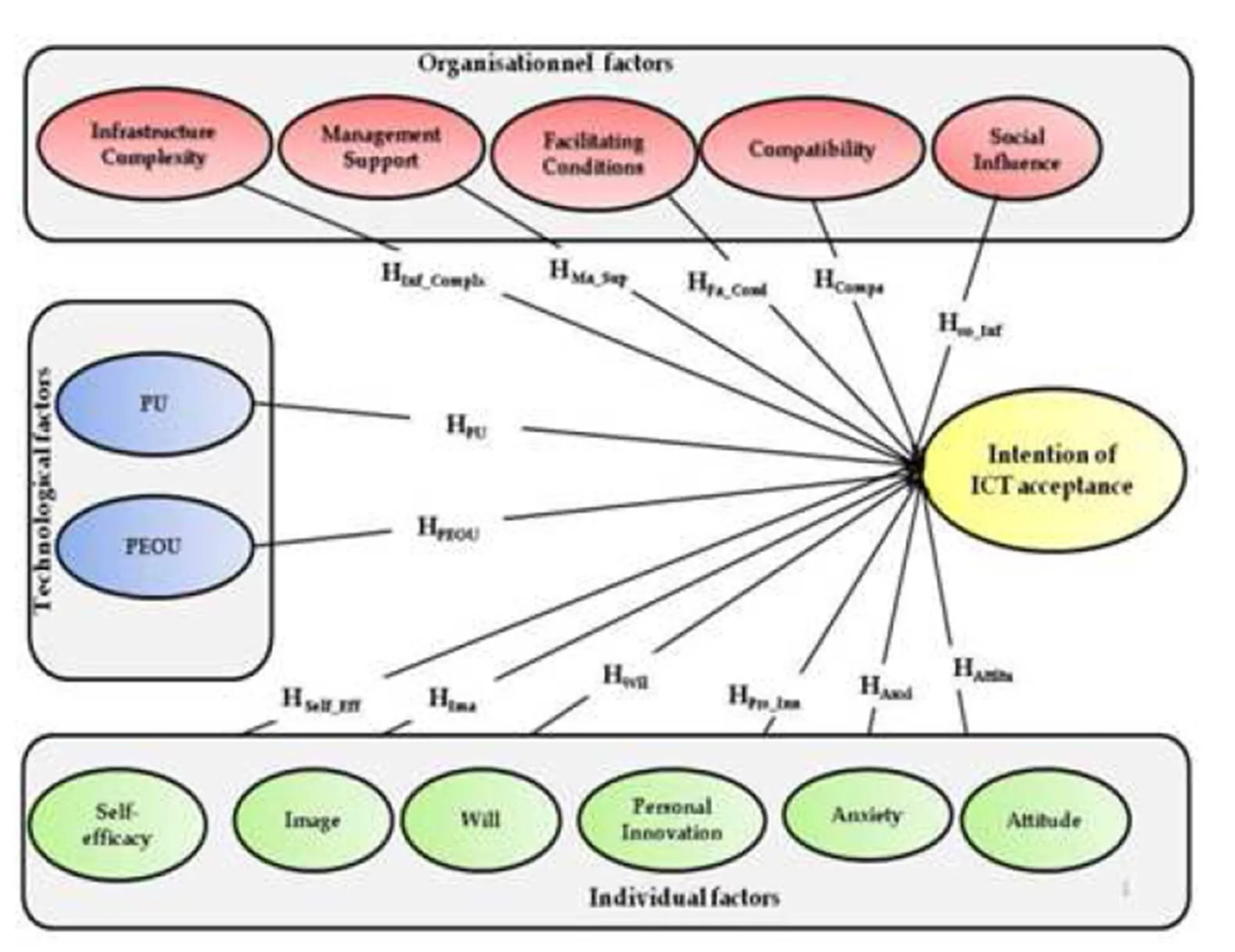 This model posits that ICT acceptance is influenced by three categories of factors:Individual, Organizational and Technological. Hence, the statement of the main hypothesis: geriatricians’ intention to accept ICT is influenced by individual beliefs, organizational structure and technological factors. It leads to three sets of hypothesis: