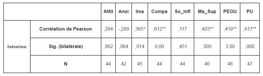 To validate the research hypothesis, a correlation analysis is adopted. For this issue, the Pearson’s coefficient was calculated between Intention of the ICT acceptance and each one of the retained variables. Results reveal that Image, Compatibility, Management Support, Perceived Usefulness and Perceived Ease of Use showed a significant positive correlation with this Intention (Table 1).Moreover linear regression results indicate 60.4% of total variance and show that only Compatibility, Perceived Usefulness and Perceived Ease of Use are the significant factors of the ICT acceptance by Geriatricians working in Moroccan health public hospitals.