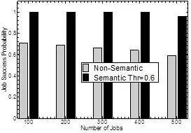 Fig. 4 shows the relationship of job success probability with a number of jobs for semantic and non-semantic cases. The result shows that a significant number of jobs are rejected under non-semantic case compared to the semantic. This rejection is due to the tight coupling between user requirements and resource availability. As a result, the resources are not utilized well. As we increase the number of jobs, the performance for semantic approach remains almost constant. The reason is that semantic matching helps removing the tight coupling between users and resources that helps enhance the job success probability.