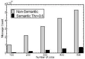 Fig. 5 shows the relationship between message count with the number of jobs. In terms of semantic approach, communication overhead is significantly lower compared to that of the non-semantic. As the probability of being matched for a user and a resource is extremely low in non-semantic, the users in this case keep exploring to find out their suitable resources. This results in exchanging a large amount of messages in the network. It is also observed that the ratio of increasing message is much higher in non-semantic compared to the semantic when demand increases.