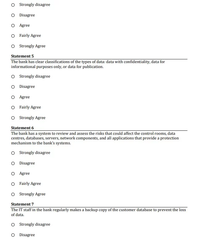 The researcher designed this questionnaire to cover these four aspects and explained the impact of ISec through the CIA elements. The participants had to evaluate the 19 sentences with one of these responses: strongly agree, fairly agree, agree, disagree, or strongly disagree. The participants’ responses would show the impact of a changing ISec on e-banking services.