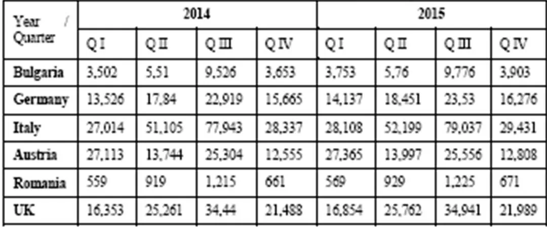 Going further to the next part of the work, this was shaped around the seasonality analysis of the data series “total nights spent”, by residents and non-residents (in thousands), in Hotels, holiday and other short-stay accommodations; camping grounds, recreational vehicle parks and trailer parks (categories as they are registered in the Eurostat database). To do this, there were chosen, except the lack of statistical data for all the European countries, six countries with touristic vocation: Bulgaria, Germany, Italy, Austria, Romania and the United Kingdom. Quarterly data analysed were extracted from the Eurostat database and spread over a12-year period, 2002-2013.