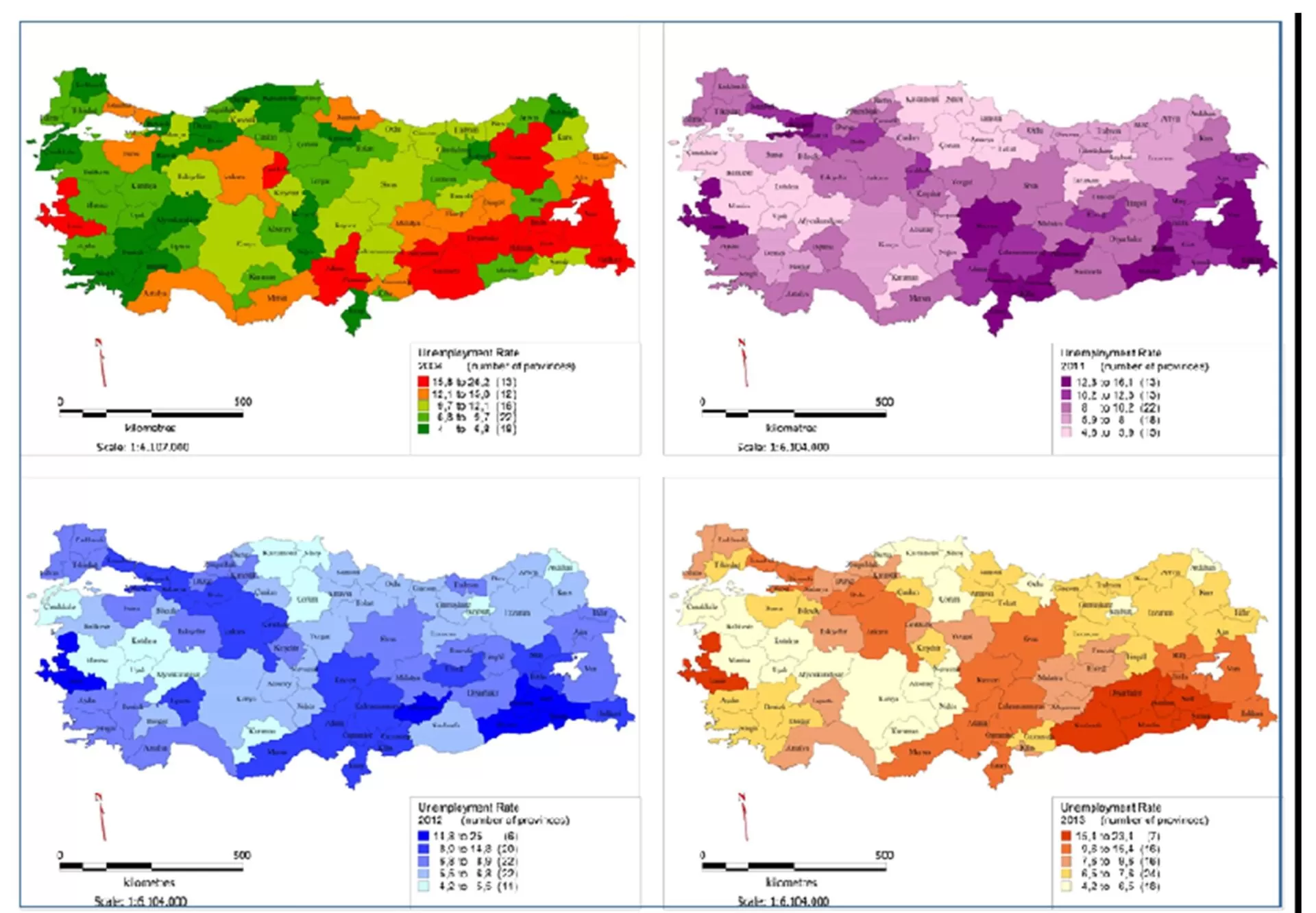 Considering all the maps, it is can be seen that unemployment rates are rather high in large provinces, such as Istanbul, Izmir, Ankara, Adana and Kayseri. Furthermore, Sanliurfa, Diyarbakır, Mardin, Batman, Siirt and Sirnak in South Eastern Anatolia Region have high unemployment rates. It is well-known that Turkey has been suffering from terrorism in South Eastern Anatolia Region and thus the unemployment rate is negatively affected by terrorist actions in this region.