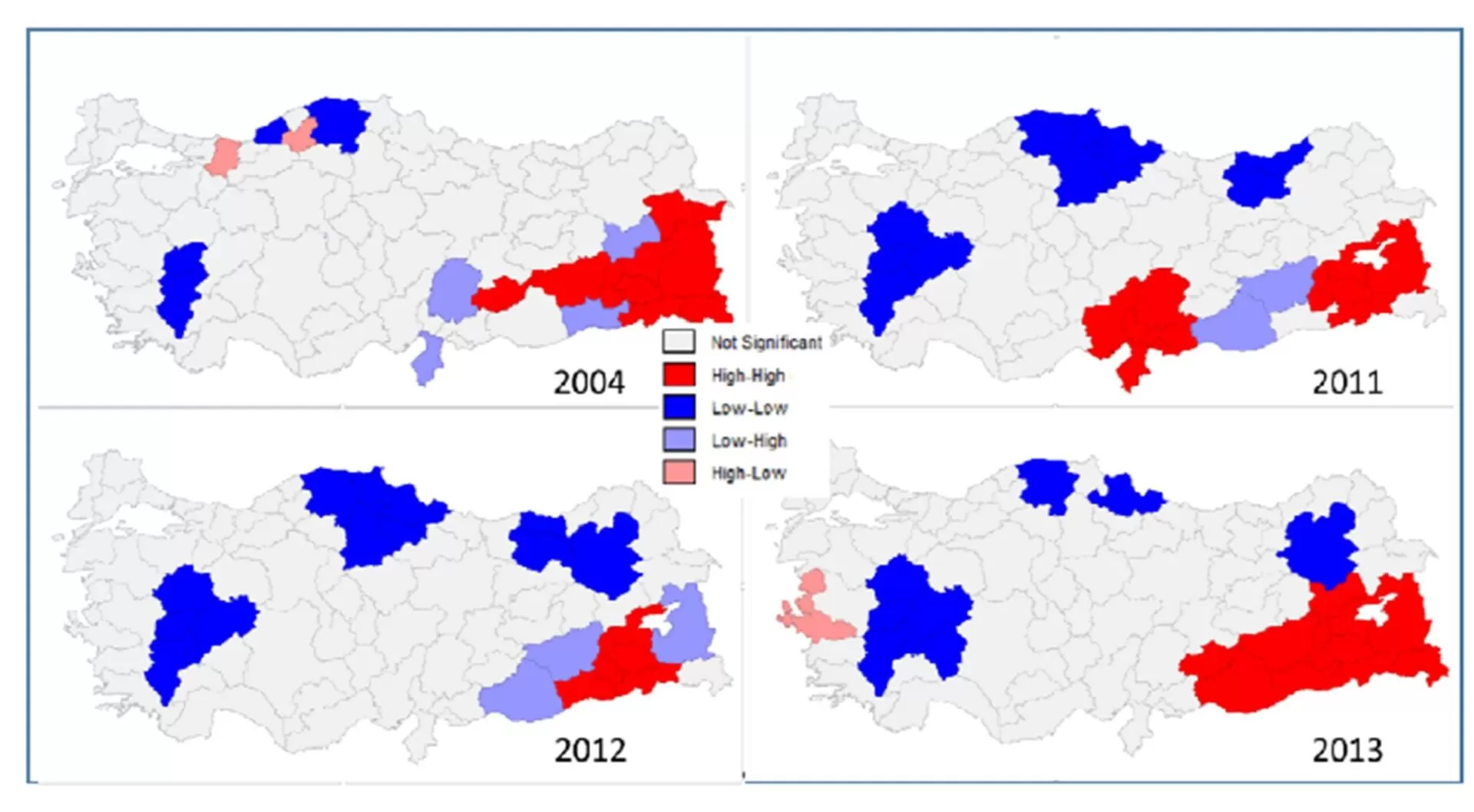 For this purpose, the LISA maps are drawn. It can be seen that the LISA cluster maps, shown in Fig 5., confirm the significant presence of local spatial autocorrelation according to unemployment rates at the provincial level in Turkey.