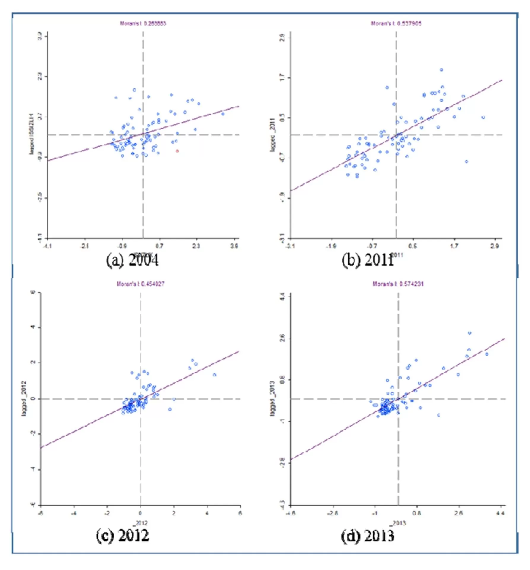 In this study, a spatial weights matrix based on the Queen Contiguity measure is used. Global Moran I’s scatter plots of unemployment rates are demonstrated in Fig 4., for 2004, 2011, 2012 and 2013. It can be observed that the X- axis shows the unemployment rate and the Y- axis shows the lag-unemployment rate defined by the weights matrix. As seen from Fig 4. (a-d), the regression line of the scatter plot of the Moran’s I as a slope is reasonably accurate. For 2004, Moran’s I for the unemployment rate is 0.2638 which suggests a clustered spatial pattern in the distribution of the unemployment rate for Turkey since the p-value of Moran’s I is less than 0.05 and thus, Moran’s I is statistically meaningful. Moran’s I increases in 2011, 2012 and 2013. They are all greater than 0.45, and the associated p-values are less than 0.05. This means that there is spatial autocorrelation between geographical areas in terms of the unemployment rates at a provincial level in Turkey.