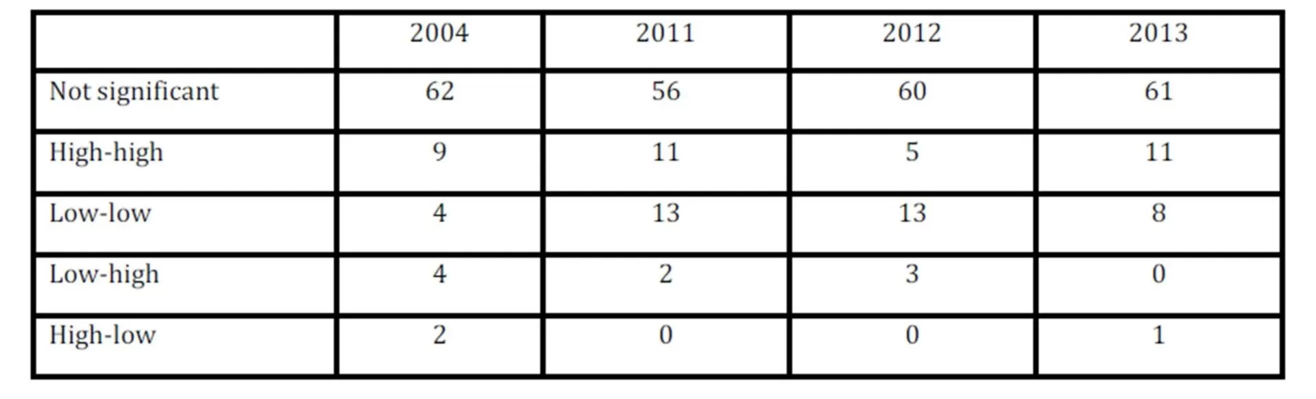 In order to further understand the spatial distribution of unemployment rates, local autocorrelation analyses (LISA) are conducted (Celebioglu, 2010). The results of the LISA cluster maps are summarized in Table 1.