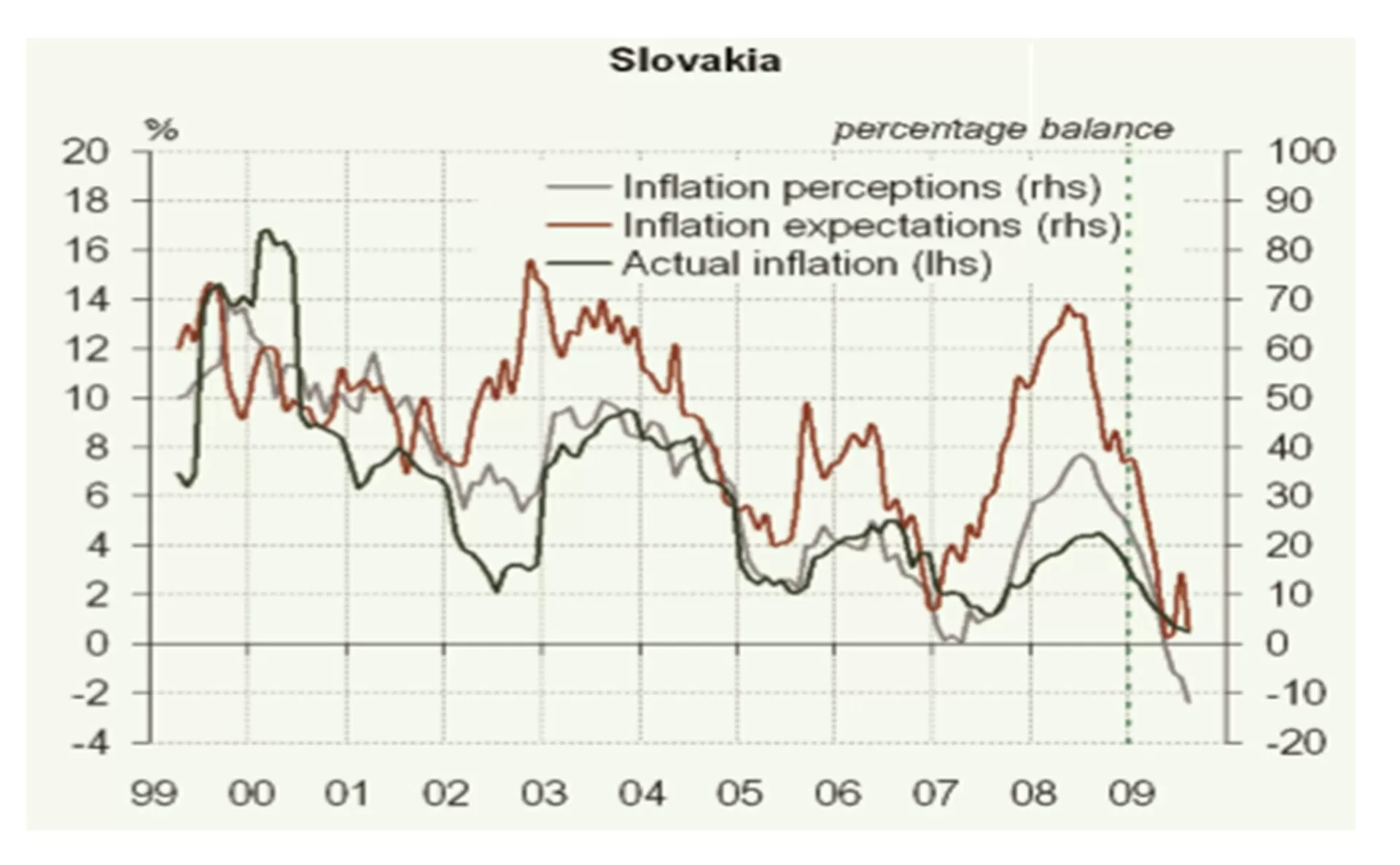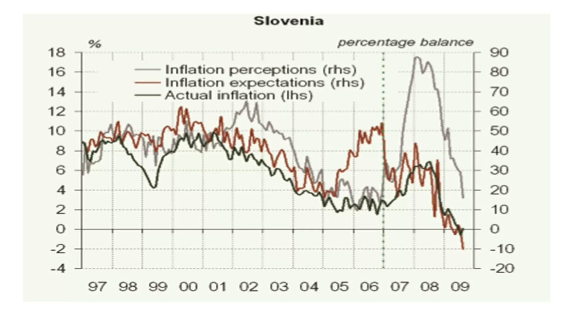 The difference between actual and perceived inflation (perceived inflation being higher than actual) was observed also in other new EU member countries. This difference was observed both in the case where the actual inflation rose (Slovenia), and in the case where the actual inflation fell (Slovakia) – see Figures in the Attachment.