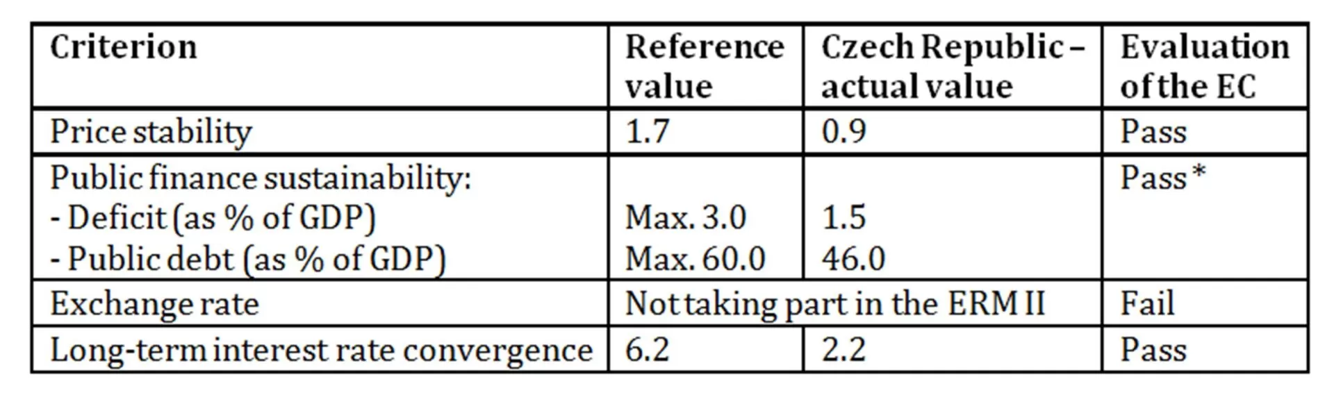 Detailed commentary should be addressed to the exchange rate criterion. The Czech koruna does not take part in the ERM II. The reason for this is a strategy that “the Czech Republic would stay in ERM II for the minimum possible period”.