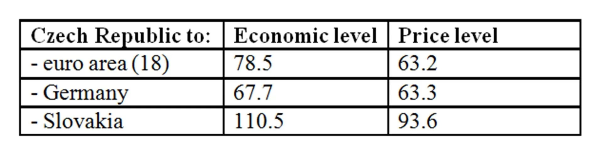 In the area of economic level, the Czech Republic got to 78.5% of the euro area (18) level in 2014. However, an indicator that compares the country’s economic level with that of its main trading partners, to which the country’s competitiveness is important, is more significant. Therefore, Table no. 3 shows this indicator in relation to Germany and Slovakia.