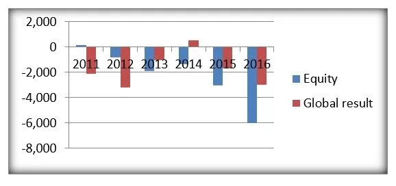 It is noted that a causal link can not be established between the global result and company´s equity. Thus, if we appreciate the company’s performance in terms of equity, we see that the highest level of the performance was recorded in 2011 and the lowest in 2016. If we analyze the company’s performance in terms of global result, we find that the highest level of the performance was recorded in 2014 and the lowest in 2012.