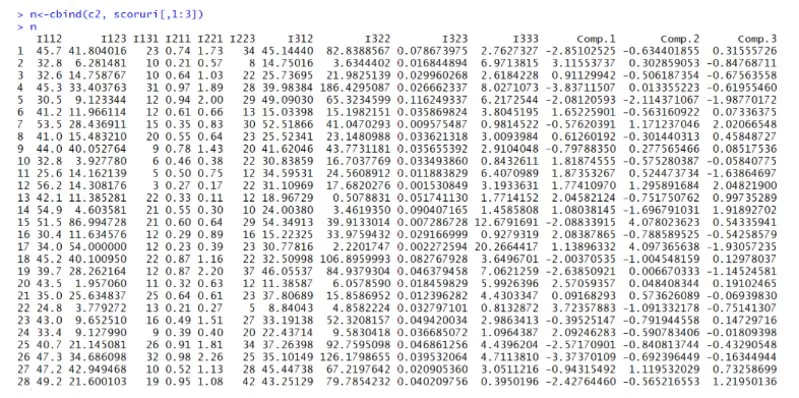 In the figure above, following the application of the princomp () function, the standard deviations of the main components were displayed, which shows the percentages of information taken by each new component created. It is also observed that the first three main components take the highest percentage of information from the data set.