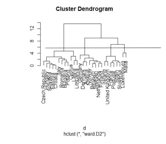 In the figure above, the WARD distance was calculated, which is based on minimizing the increase in the sum of the squares of errors, after the groups are merged into one. By making a cut in the figure above, at the level of about 6, 3 clusters are obtained. The first cluster is made up of countries such as the Czech Republic, Hungary, Slovakia, Estonia, Croatia, Romania, Bulgaria, Poland, Cyprus and Lithuania.