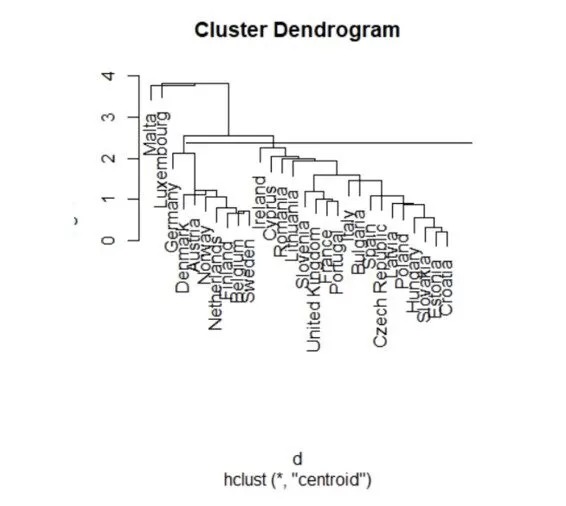 Using the centroid method, the Euclidean distances between the arithmetic averages of the components of the elements in the three groups were calculated, using the centroid of the clusters. After plotting a cut in the dendrogram, the distribution of the analyzed countries is observed in three clusters. Luxembourg and Malta are part of the first cluster, while the second cluster is made up of countries such as Germany, Denmark, Austria, Norway, the Netherlands, Finland, Belgium and Switzerland.