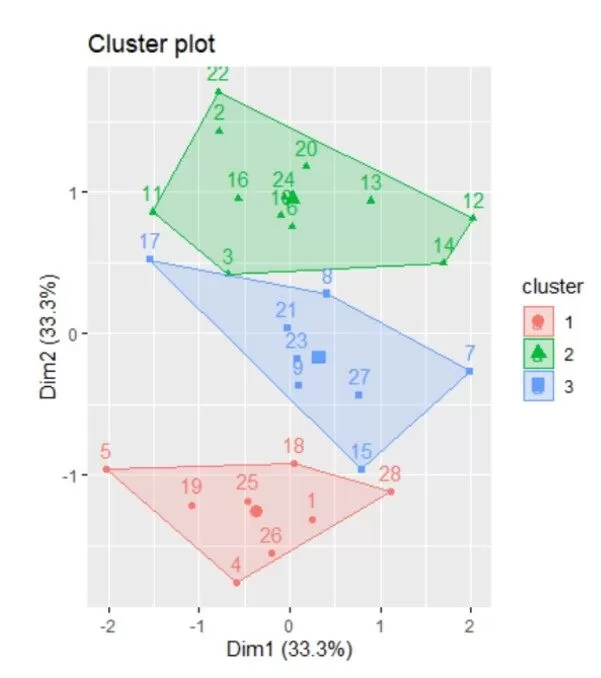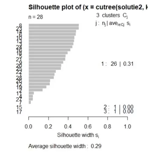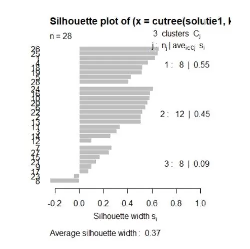 From the figure above, realized in R Studio, the 3 clusters and the countries that form them are more clearly observed, represented by numbers. Also, the border countries, such as: 12 (Italy), 7 (Estonia) and 5 (Denmark), have small silhouette coefficients.