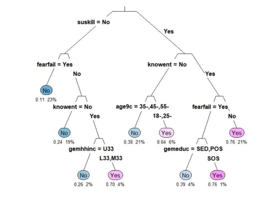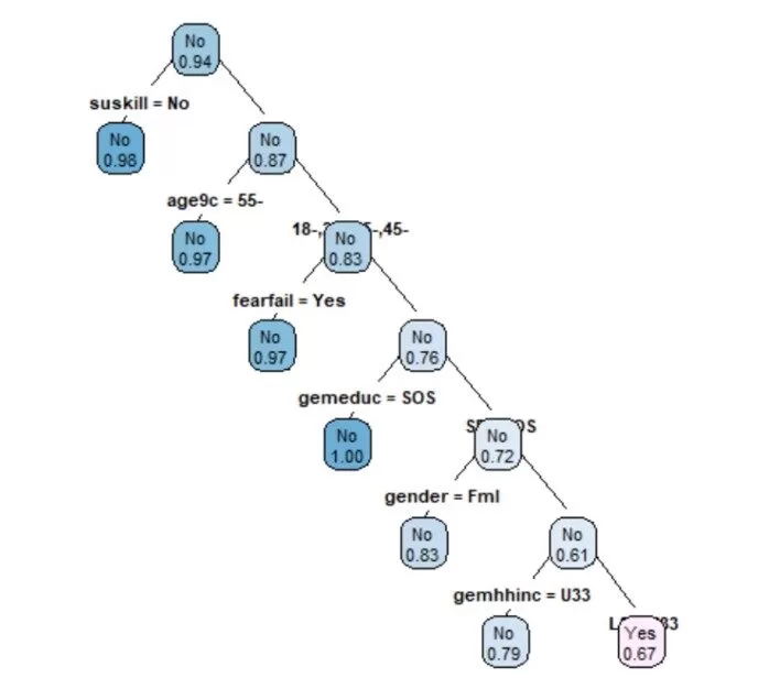 The tree below was made using the training set. It is noticeable that there is a probability of 0.98 for individuals who consider that they do not have entrepreneurial skills to open a business.