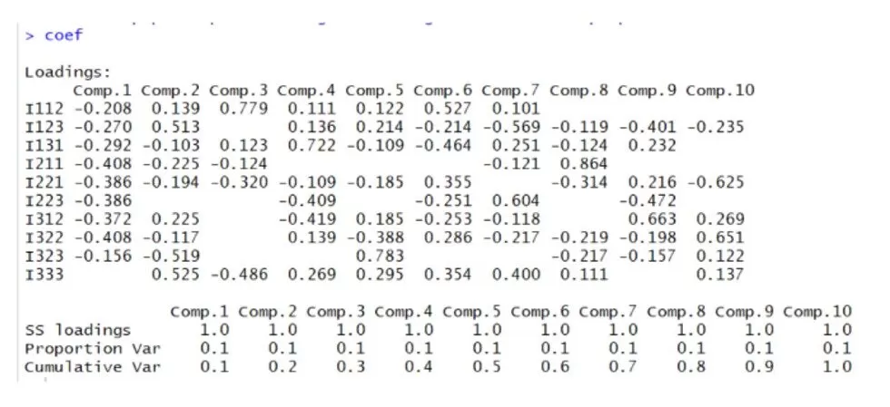 Using the summary () function, the simple proportions and cumulative variance ratios of the main components resulted in R. This confirms that only the first three main components will be kept in the analysis, the standard deviation of the first component is 2.1371229, of the second 1.3773048, and of the third 1.0348787, exceeding the value 1, according to the criterion to Kaiser. It is also found that the first main component retained in the analysis accounts for 45.6% of the total information, the second holds only 18.9% of the total information, and the third holds only 10.7% of the total information.