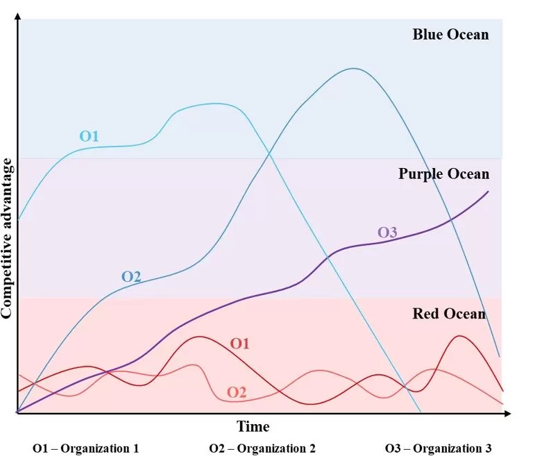 The third situation is represented by the proposed Purple Ocean. In this case, an organization (O3), which is at some point in the Red Ocean, is launching one or more different products from its core business in order to diversify its activity and to adapt to the constantly changing market. In this case, the organization does not get distracted from its core activity but, reorients itself towards new opportunities, using the know-how and resources it already has. Usually, it is using one or more models which are described by Bonie and Joseph (2019). Moreover, the organization’s competitors O1 and O2 are now competing on a single market with O3, while O3 diversifies its products on different markets, using its resources and know-how as competitive advantage.