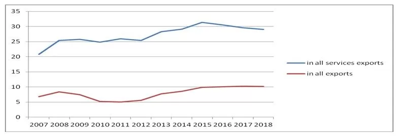 When analyzing the Romanian export values in 2018 compared with the corresponding values in 2007 using the data from International Trade Centre (ITC) and from World Bank, one can see that all exports almost doubled in value (1.99), the services export values are slightly more than double (2.14), while transportation exports almost tripled their value (2.99), that shows the increasing importance of transportation services exports. The share of transportation exports in services exports grew from 20% to 30% and the share of transportation exports in all exports grew from 5% to 10%.