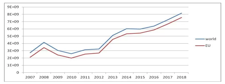 Fig. 1: The evolution of the Romanian transportation export values between 2007 and 2018