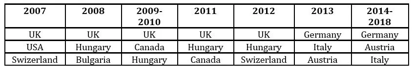 Table 1: Top three countries for the Romanian transportation exports 2007-2018