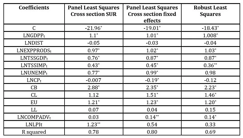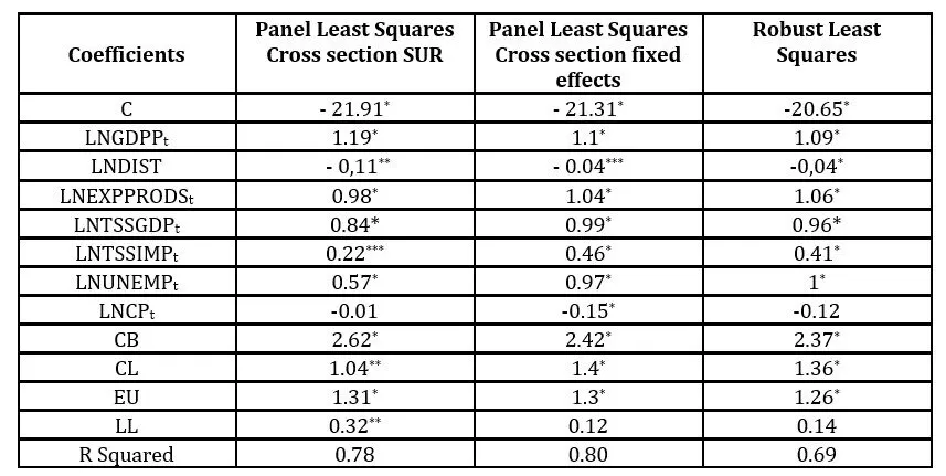 For the new tested variables, the comparative advantage has the expected sign and small values and it is statistically significant only for the second and the third model, while Logistic Performance Index of the partner country has the expected sign; it is significant in the first model with a high value and insignificant in the other two models with smaller values.