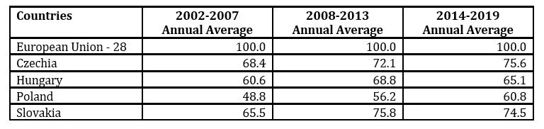 Table 2: Labour Productivity per hour worked in the EU-28 and V4 countries in 2002-2019 (EU28 = 100, periodic averages)