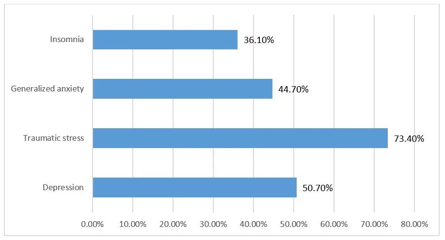 From a psychological perspective, the pandemic situation of COVID-19 has been undoubtedly affecting people all over the world. In a survey of people at higher risk of being infected with Coronavirus, the rates of depression, traumatic stress, generalized anxiety and insomnia reached alarming levels (Liu et al., 2020). The following Figure 1 illustrates them: