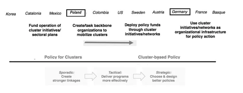 There is a different approach to cluster policy implemented in various countries (see figure 1). In some countries, it can be noticed that the government offers a dedicated support program for the cluster as a part of its policy to create stronger linkages between units. This situation can be seen in Korea, Catalonia, Mexico and Poland. On the other side, there are countries with strategic cluster-based policy, where they use clusters and networks as organizational infrastructure for policy action. In this group, Germany, France, Basque can be found.