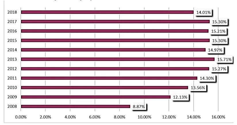 At the level of the European banking sector, lower weights of the minimum capital requirement for operational risks are noted in the total minimum capital requirement, as can be seen in Figure 11. Thus, in 2018, the minimum capital requirement for operational risks in the European banking sector accounted 10.54% of the total minimum capital requirement, compared to the Romanian banking system, where the share was 14.01%.