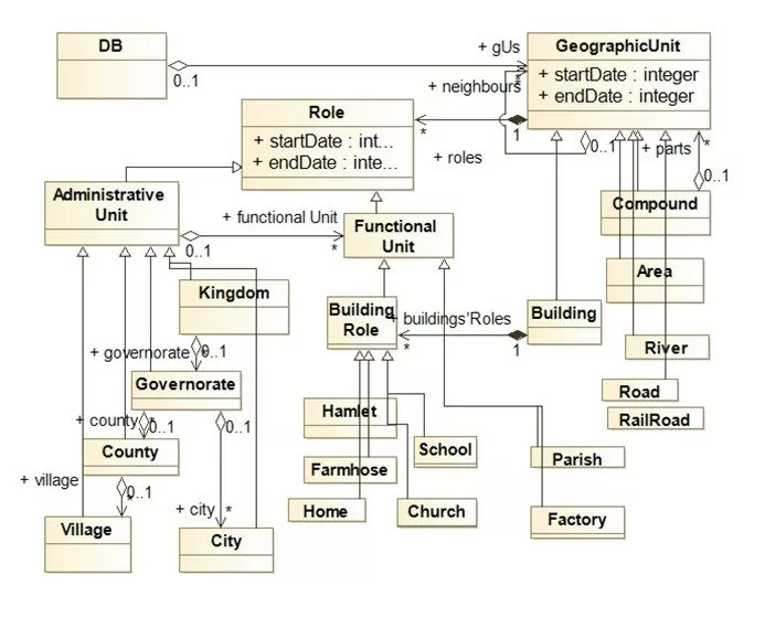 The class diagram on Fig 1 (it is a modified and extended version of the diagram on Fig. 1 presented in (Kosiuczenko, P. (2022))) shows five fundamental classes: GeographicUnit, Location (not shown on the diagram), Role, AdministrativeUnit and FunctionalUnit. The class DB stands for a data base.the basic units are geographical objects which correspond to the root class GeographicUnit. Objects of the root class are characterized by start and end date, geographic coordinates (not shown on the diagram) and can be farther specialized. Objects may play different roles, e.g., a building can play the role of a school and of an office. There are essentially two categories of roles: AdministrativeUnit and FunctionalUnit. This results in a dichotomous division of roles. All other roles are subcategories of these two classes. The geographic units can play different roles. The roles are objects of the class Role. This information can be specified in greater detail in appropriate subclasses.
