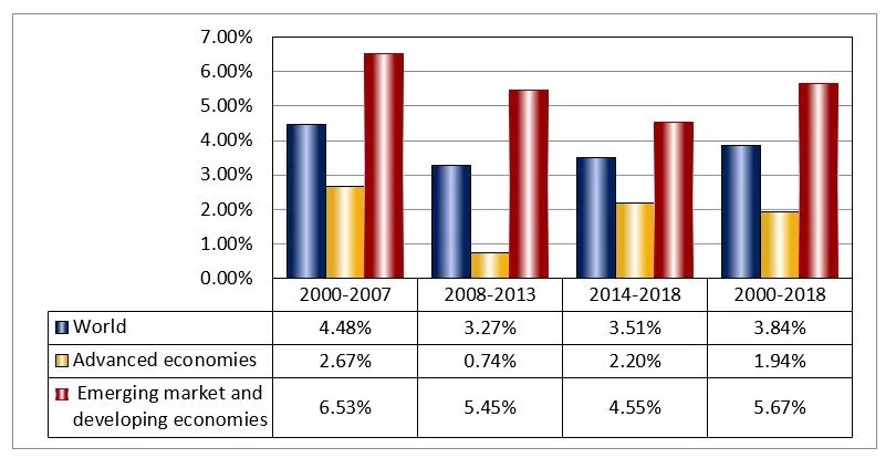 Fig. 1: Comparison of real GDP growth in advanced economies, emerging market and developing economies and in the world in: 2000-2007, 2008-2013, 2014-2018 and 2000-2018, annual averages in %.