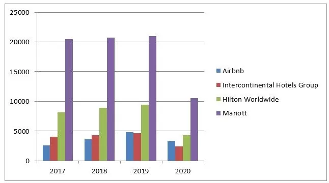 With the growing popularity of its person-to-person rental model, Airbnb has become a top competitor in the hospitality industry. Airbnb’s annual revenue surpassed the revenue of the Intercontinental Hotels Group in 2019, based on data from Macrotrends (2021).